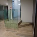 Il piano secondo dell’edificio, adibito ad uffici, è stato oggetto di una ristrutturazione completa, che ha portato alla realizzazione di 10 uffici e una sala riunione, oltre a spazi accessori, a servizio dei dipendenti. Per i pavimenti è stato usato travertino romano in lastre da 60 x 60 cm, mentre per le pareti di chiusura degli uffici è stato usato un sistema a pareti mobili in lastre di cristallo temperato e serigrafato e pannelli in wengè, con struttura portante in profili di alluminio lucidato e spazzolato.